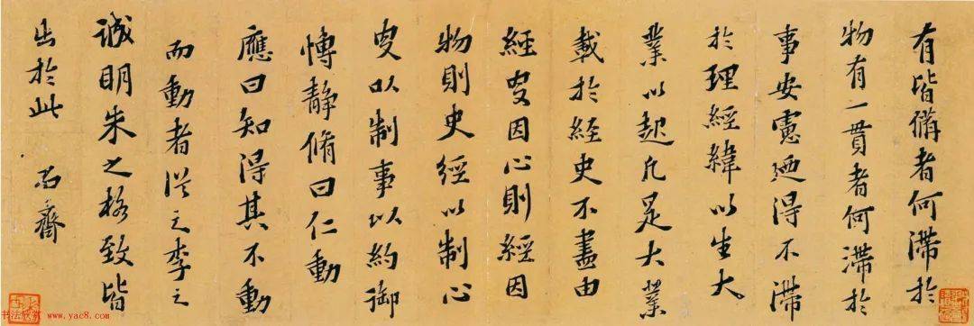 黄道周(1585-1646)字幼平,号石斋,明末著名的学者、书画家、民族英雄。天启二年(1622)进士,官至礼部尚书,明亡后抗清,被俘殉国,谥忠烈。 黄道周楷书《宓衍堂铭》,15×47.3cm,香港中文大学艺术博物馆藏。 释文:有皆备者,何滞于物?有一贯者,何滞于事?安虑乃得,不滞于理。经纬以生,大业以起。凡是大业,载于经史。不尽由经,史因心则经, 因物则史...