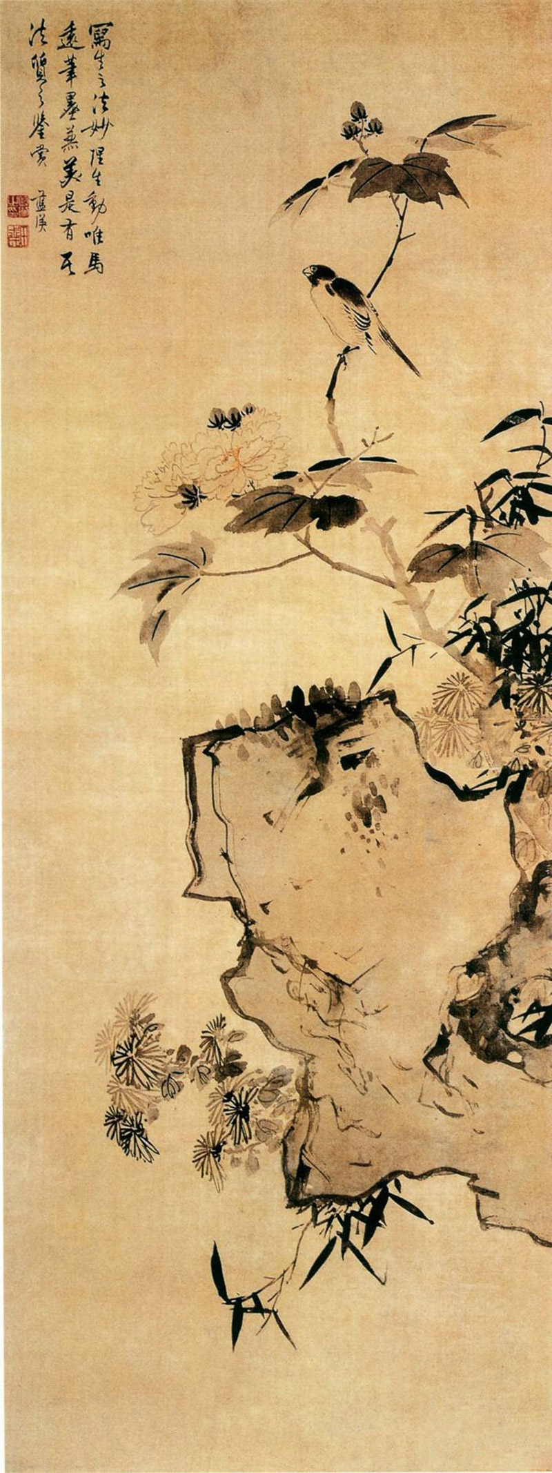 历代国画明 蓝瑛《拒霜秋鸟图》赏析3局部 局部 《拒霜秋鸟图》是中国明代画家蓝瑛的国画作品。该画为立轴,水墨,绢本,纵163.9厘米,横62.3厘米,上海博物馆藏。 此图聚于右侧而感平稳,湖石以枯淡之笔钩勒,稍加墨苔;花朵用淡墨双钩;叶子以适度的水墨,侧笔横超,再用深墨勾出叶茎。枝上的蜡嘴乌,墨彩醒目,栩栩如生。画中湖石横伸,一枝芙蓉从石后斜出上挺,枝上伫立一只蜡嘴鸟;石旁幽草数枝,伴着两丛秋...2026-03-27
