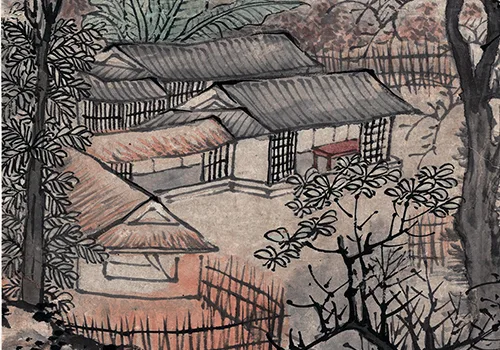 《秋山渔隐图》创作于1633年(蓝瑛49岁),纸本设色,现藏天津博物馆。画中远景群峰高耸,淡墨披麻皴勾勒出山石的苍润;近处河面泊两艘棚船,船尾二人对坐闲谈,岸上古木虬曲,深秋叶落,农舍错落,栅栏环绕。全图设色清丽,工致处如树法细腻,疏简处如山石逸笔,堪称蓝瑛“职业功底与文人情怀”的集大成之作。