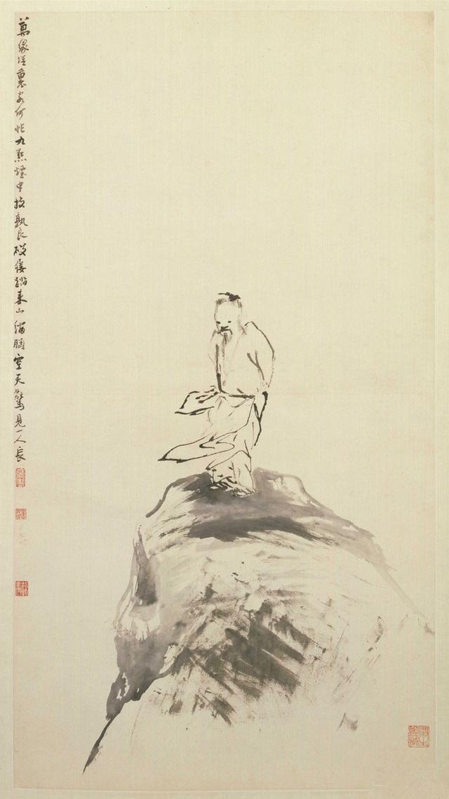 此图是高氏“指画”人物的代表作。所谓指画,即以手指蘸墨代替毛笔作画,用指尖、指甲、指背、掌沿等不同部位着纸,画出不同质感的线条,既保持了毛笔画的传统韵致,又有自己简约、刚健的特殊风味,从而能以得心应手地表现物象。此图中的人物、山石便是作者以指画勾线造型和皴擦点染的,因为不受毛笔的约束,所以线条飞动飘逸,点染松活,饶有意趣。