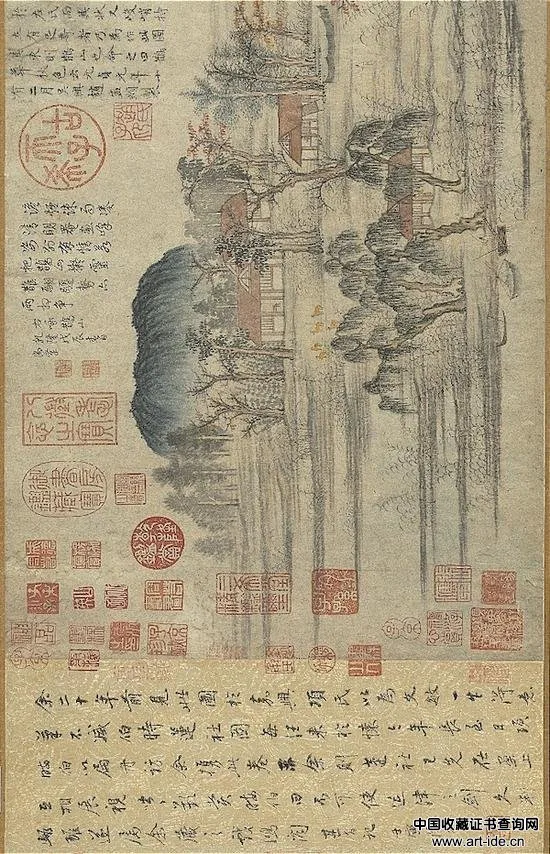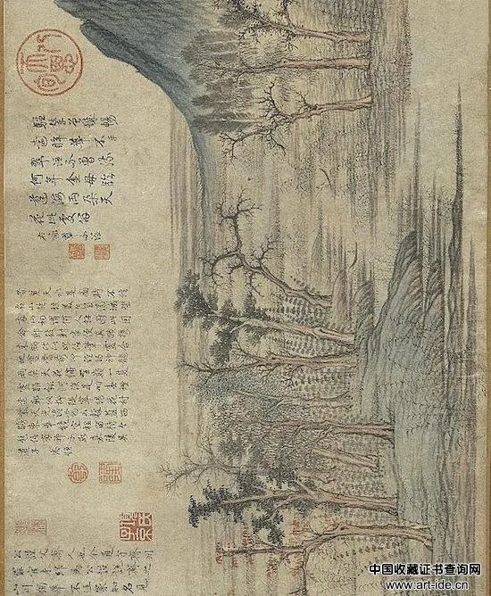 中国文人画史上的名作《鹊华秋色图》,更可见出秋意的悠远与明净。此画是元代画家赵孟頫于元贞元年(1295)回到故乡浙江为好友周密所作的纸本水墨设色山水画,现藏于台北故宫博物院。鹊华秋色图描绘的是济南东北华不注山和鹊山一带秋景,画境清旷恬淡,表现出恬静而悠闲的田园风味。采用平远构图,以多种色彩调合渲染,虚实相生,笔法潇洒,富有节奏感。 图中两座山峰,鹊山为淡花青,华不注山为淡青绿,颜色较为醒目。其他诸景如洲渚、树木等多施以深浅不一的青色,房屋、牛群和一些树叶则用红、黄、精等暖色系,色调冷暖交汇,既显示出秋的清旷高洁,亦呈现出人情的和乐安详。