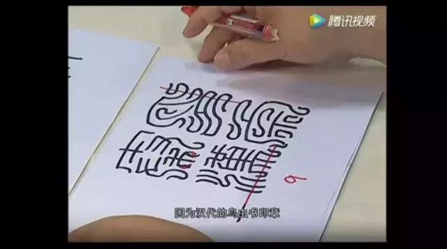 “汉”字“水”字旁旁边这个盘曲是一个难点,要求它非常流畅,同时在流畅中又有一种迟滞的感觉,就好像一条河流到这里转了一个非常急的弯儿,但是它还保持着比较均匀的流动感。因为有了中间这个弯,所以“水”字的其他部分我们就不用再做任何的艺术处理,保持它篆书的本形就可以,这部分鸟虫篆的元素已经足够了。