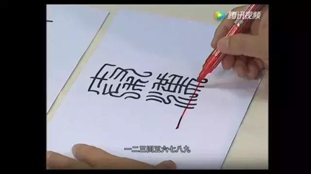 因为“印”字里我们已经刻画了两个鸟头的形状,所以我们在最后收笔的这个部分,就没有再刻画。但是我们在这里,给它刻画了一个回纹的交接,就是说增加这里面的流动感,避免这几笔图像的排叠过于单调,好,这个“印”字我们就刻完了。