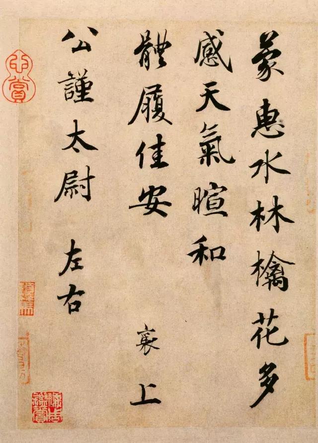 北宋 蔡襄《蒙惠帖》释文:蒙惠水林檎花,多感。天气暄和,体履佳安。襄上,公谨太尉左右。