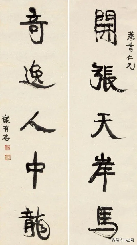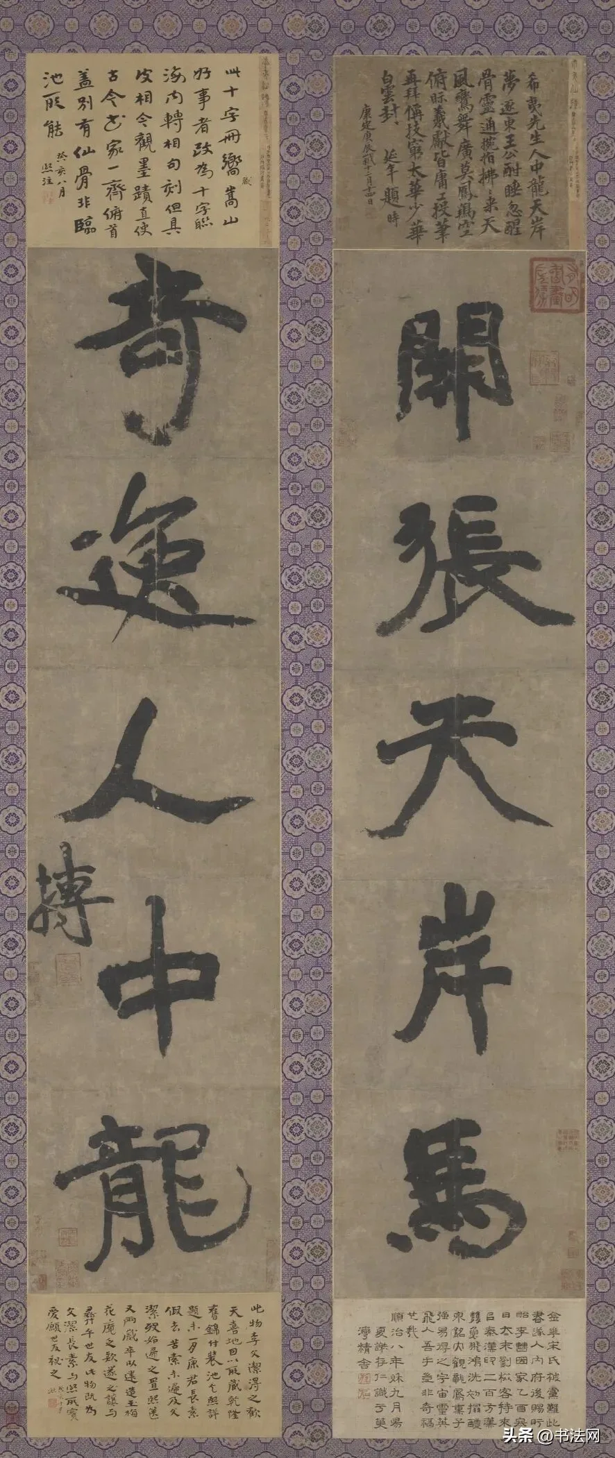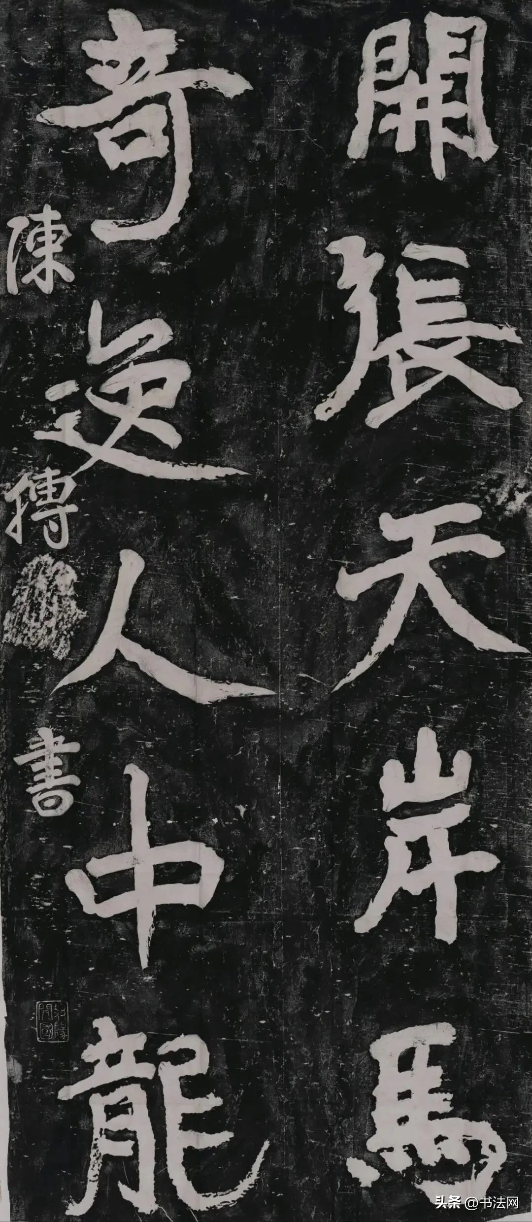 至于这幅五言对联,更是精妙至极,号称“天下第一联”,刻于河南洛阳龙门石窟西山潜溪寺,与宾阳洞之间的石龛中,落款只有一个“抟”字,笔画凝厚醇和、圆融坚韧,气力扎实,而姿态超逸,质感十分高级,康有为将其评作“神品”,并称赞“飞逸奇浑,分行疏宕,翩翩欲仙”。