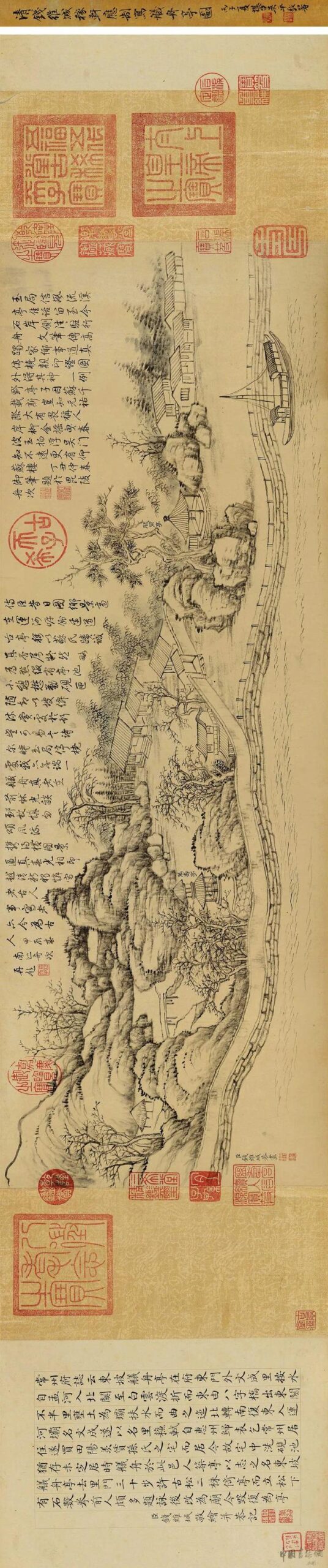 历代国画沈周《采菱图卷》11沈周(1427-1509年),字启南,号石田,晚年号白石翁,长洲(今江苏苏州)人。明代中期文人画“吴门画派”的开创者,与文徵明、唐寅、仇英并称“明四家”。 《采菱图卷》描绘了江南夏日采菱的景象,远山青暝,湖光粼粼,水村曲桥,渔舟浮萍,一派江南胜景。画面中充满了生活气息和田园风光,展现了江南水乡的独特韵味。 沈周擅画山水、花卉,尤以水墨浅绛山水著称。在《采菱图...2025-10-14