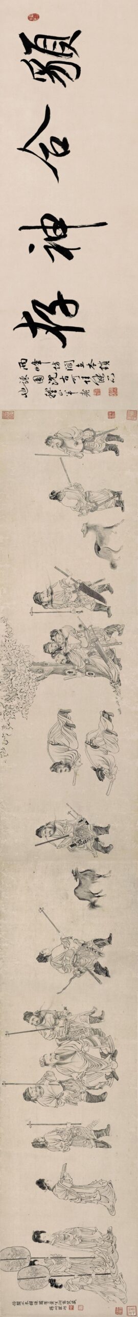 历代国画罗聘 《锁谏图》卷9罗聘(1733-1799),清代画家,“扬州八怪”之一。字遯夫,号两峰,又号衣云、花之寺僧、金牛山人、师莲老人等。祖籍安徽歙县,其先辈迁居扬州。为金农入室弟子,布衣,好游历。 人物、佛像、山水、花果、梅、兰、竹等,无所不工,笔调奇创,超逸不群,别具一格。善画《鬼趣图》,画鬼态无不极尽其妙,借以讽世。亦善刻印。金农死后,他搜罗遗稿,出资刻版,使金农的著作得以传...2025-10-09