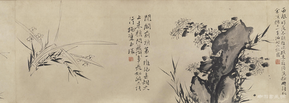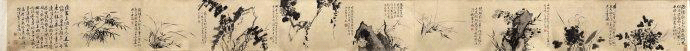 历代国画明 徐渭《墨花九段图》卷11明 徐渭 墨花九段图卷 纸本墨笔 46.6x625cm 北京故宫博物院藏 水墨画兴起于唐,到宋代时有了很大的发展,《宣和画谱》曾提及:“凡于翰墨之间,托物寓兴,则见于水墨之戏”,强调水墨之于托物寓兴、写意言志的重要性。但是真正将写意技法完全落实于绘画中,应该说要到明代文人水墨花鸟画兴起后才可算是正式完成 。而一般谈及明清水墨大写意...2026-03-27标签:人物画 / 明代 / 花鸟画 / 草书
