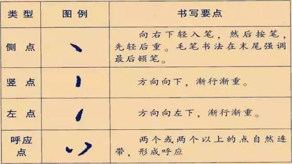 8原标题:练好硬笔字:第二讲《点的写法》 一、点的写法 点:(也叫侧)在字中起画龙点睛、活跃神态的作用。形态各异,变化较多,一般有侧点、左点、撇点、挑点、呼应点几种。 呼应点:羊角点(左右点)由侧点和撇点组成,上下点由两个侧点组成,长点(反捺)也是侧点的延长,向背点由撇点和侧点组成。 点如高空坠石,书写时要胸有成竹,干净利落。其分类及书写要领如下图...