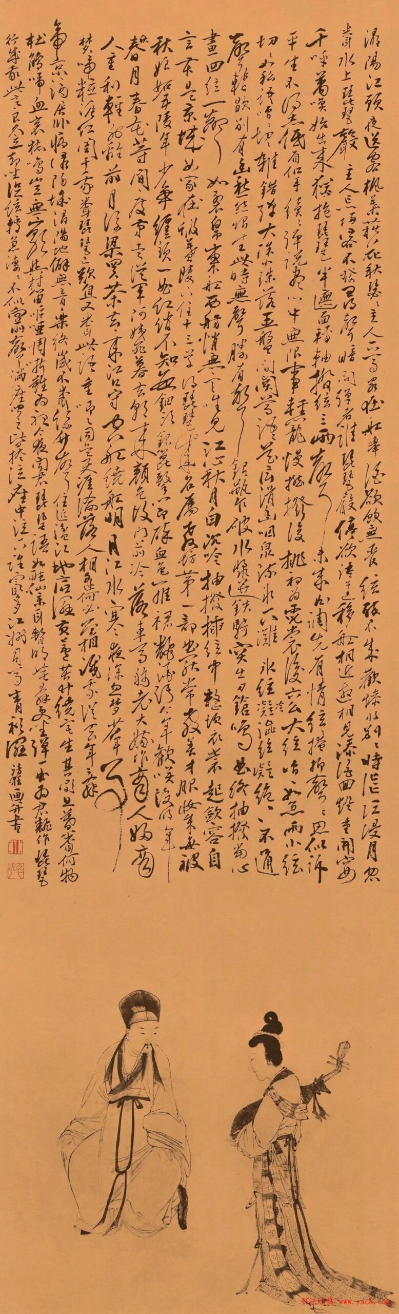 郭诩(1456-1532),字仁弘,号清狂道人,江西泰和人。工书画,善山水,又善杂画,信手作人物,辄有奇趣。 郭诩书画《琵琶行》,纸本154×46.6cm,故宫博物院藏。 此图取自白居易的《琵琶行》之意,画下方绘二人,诗人盘腿而坐,琵琶女怀抱琵琶低头不语,两人的不期而遇皆在琵琶声中熟识。 郭诩行草书法《琵琶行》,笔势纵横奔放,枯润纤秾皆在章法之中。...