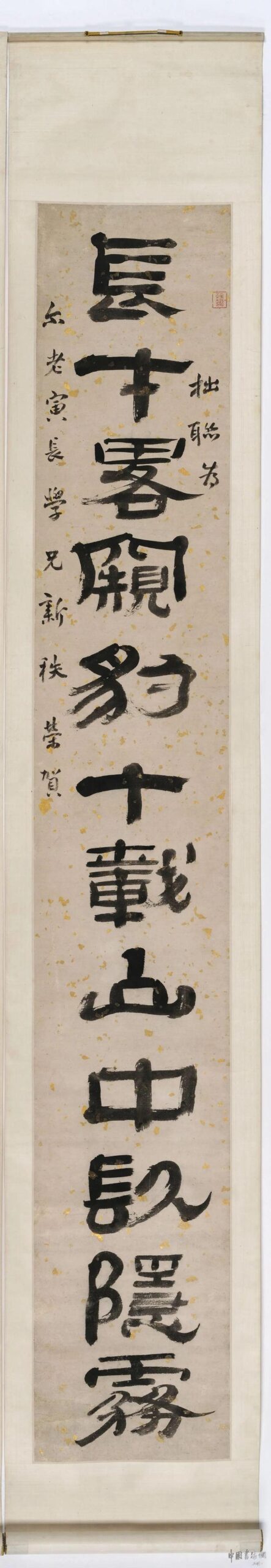 高凤翰 隶书《长才大手十二言联》5高凤翰 隶书《长才大手十二言联》 立轴 水墨洒金笺 177×26.5 cmx2 释 文:长才略窥豹十载山中久隐雾, 大手本屠龙一割海上小煮鲜。 钤 印:凤翰之印、西园甫、余趣(2印参见《中国书画家印鉴款识·高凤翰》159印,821页) 题 识:拙联为尔老寅长学兄新秩荣贺,东海学弟高凤翰顿首。 高凤翰隶书得郑谷口遗则而益以拙重,盖其精于篆刻,腕力非凡,故潇洒 ...2025-10-09