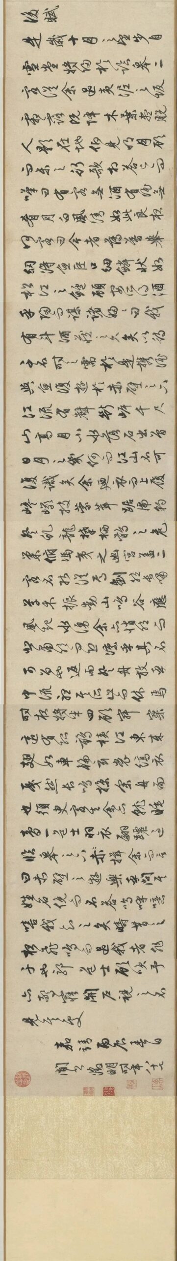 祝允明行草《牡丹赋》20明代祝允明《牡丹赋》行草,嘉靖甲申(1524年)春三月望日书,祝允明时年65岁,纵30.6厘米,横529.6厘米,故宫博物院收藏。 此卷行草书《牡丹赋》,有自题云:“甲申岁春三月望日,过汤氏西园观牡丹盛开,廷用酒次出纸索书舒元舆牡丹赋,遂书以归之。允明”,并钤“晞哲”、“包山真意”二印。可知该卷是应友人所请,书唐舒元舆所撰文学名篇《牡丹赋》,时在嘉靖甲申(一...2025-10-08