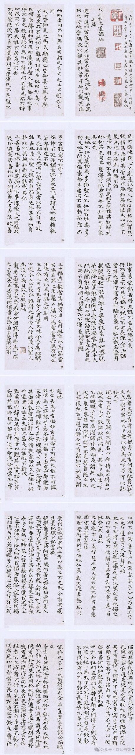 石涛《道德经册》3石涛的楷书取法于魏晋书风,同时融入六朝造像记的笔意,并参以隶法,形成别具一格的个人风格。他取法褚遂良、倪瓒等人,线条提按节奏和笔画粗细上的变化丰富,笔墨丰润,天真烂漫。 石涛的楷书字形大小参差,正欹错落,不拘泥于成法。他善于根据画面的整体风格来选择和变化书法风格,使得书画相得益彰。他的小楷作品往往舍弃技法的极致呈现,用笔、结字都暗藏一个“拙”字,给人一种“无...2025-09-30