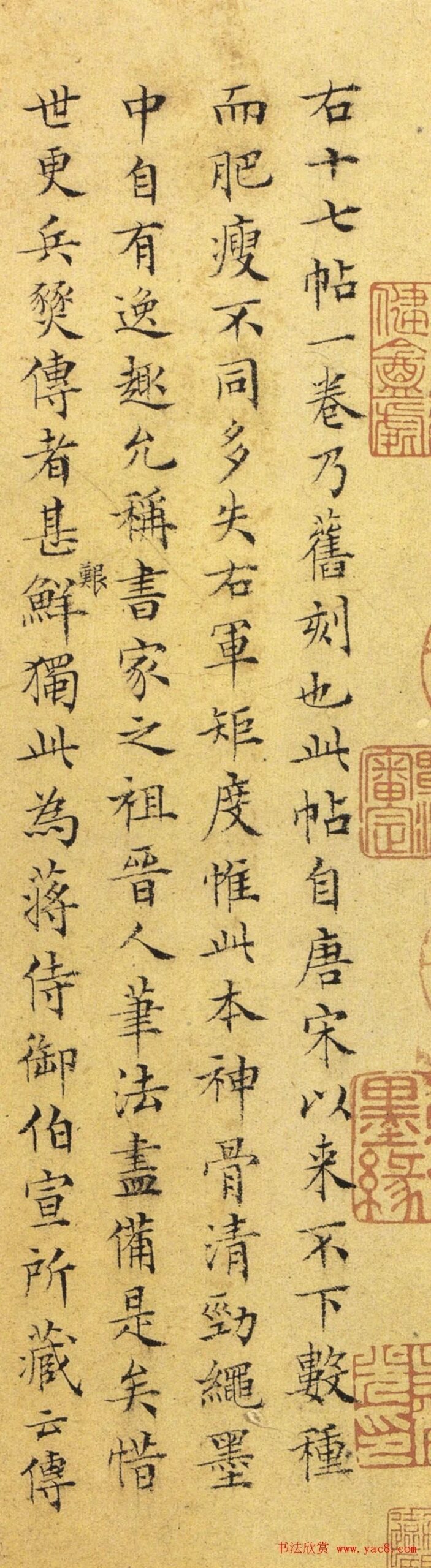 文徵明56岁小楷《跋宋拓右军十七帖》3文徵明56岁小楷《跋宋拓右军十七帖》 1525年八月十八日,为蒋诏(伯宣)跋旧刻《十七帖》,考定为宋拓,并朱书释文于旁。 右《十七帖》一卷,乃旧刻也。此帖自唐宋以来不下数种,而肥瘦不同,多失右军矩度。惟此本神骨清劲,绳墨中自有逸趣,允称书家之祖。晋人笔法尽备是矣。惜世更兵燹,传者甚艰鲜。独此为蒋侍御伯宣所藏,云传自上世。且纸墨完好,纤悉具备,诚不世之琛也,为...2025-09-23