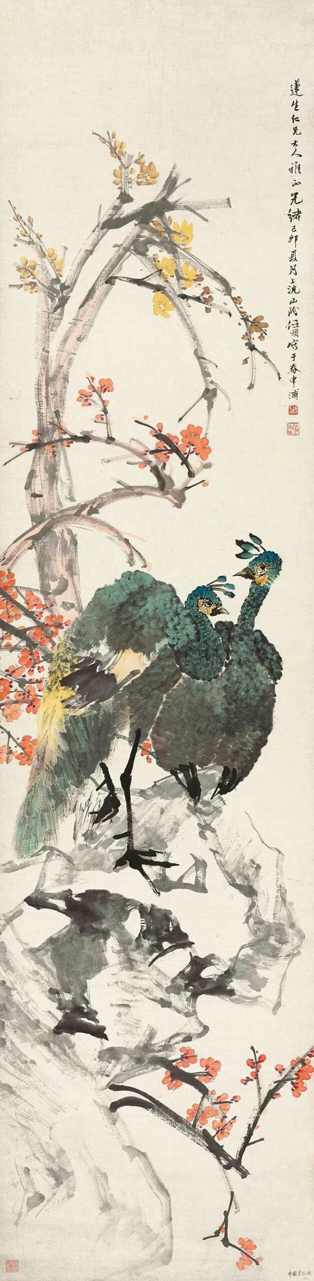 任颐《孔雀迎春》4任颐《孔雀迎春》 尺寸:245×60.5 cm.约13.3平尺 创作年代:光绪己卯(1879年)作 钤印:颐印、任伯年(参见《中国书画家印鉴款识·任颐》25、38印,307页) 莲生仁兄大人雅正,光绪己卯夏月上浣山阴任颐写于春申浦。 钱镜塘鉴定任伯年真迹之印 —版权声明— 版权归原创者所有,并不代表本网赞同其观点和对其真实性负责。如涉及作品内容、版权和其它问...2025-09-30