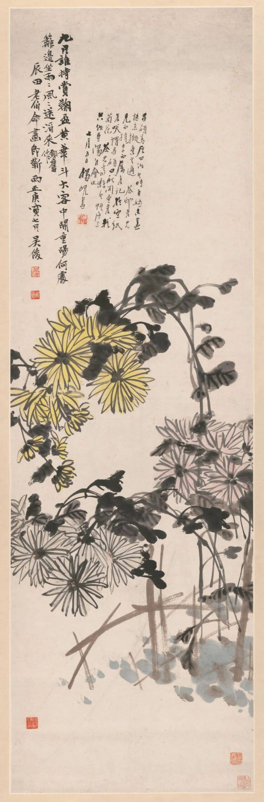 吴昌硕笔下的菊花33清 吴昌硕重阳画菊 “九月谁持赏菊杯,黄花斗大客中开。重阳何处篱边坐,雨雨风风送酒来。” “陶令篱边,花大如斗。杯泛金英,延年益寿。” “年年头白东篱叟,种得菊花大如斗,酌以玉瓶桑落酒。”, “秋菊灿然白,入门无点尘。苍黄能不染,骨相本来真。近海生明月,清谈接晋人。漫持酤酒去,看到岁朝春。” “雨后东篱野色寒,骚人常把菊英餐。朱门酒肉熏天臭,醉赏黄花当牡丹。...2025-09-30标签:篆书 / 行书 / 近现代