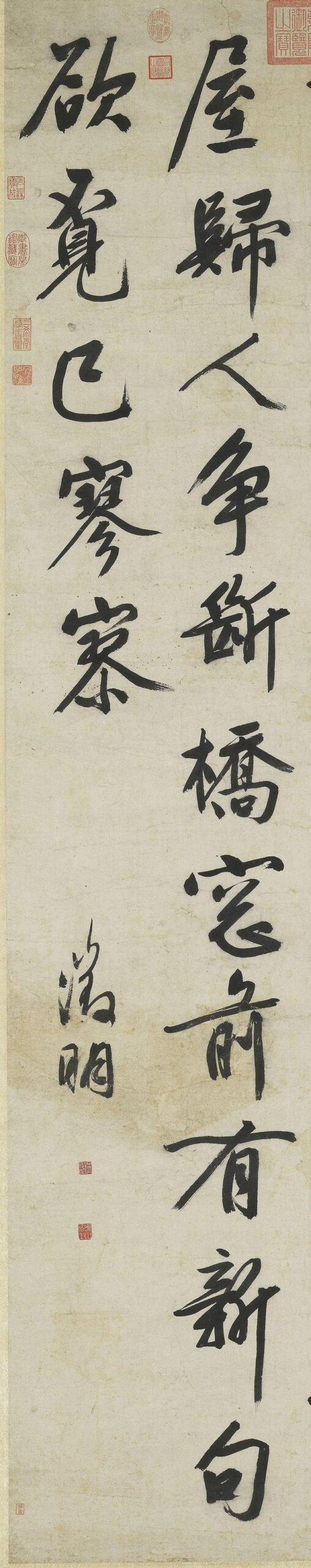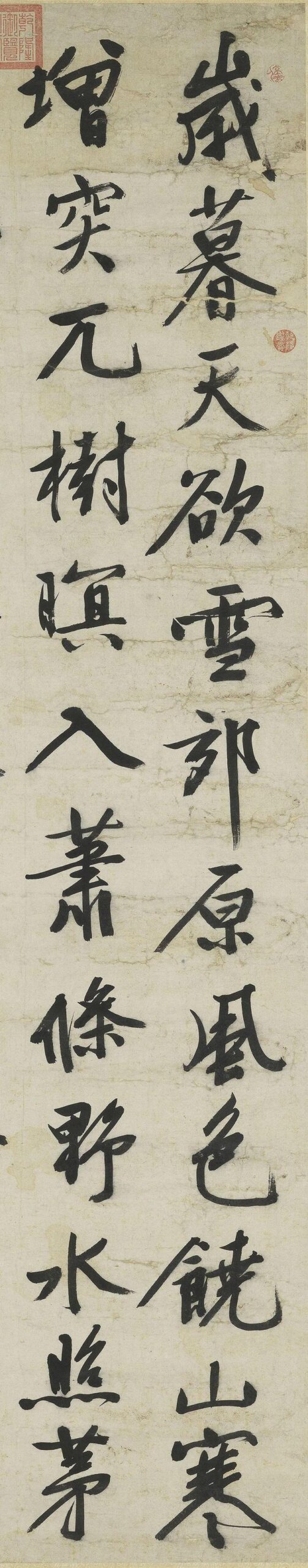 历代书法文徵明《岁暮天欲雪》3文徵明行书,五言律诗轴,191×72.2厘米,台北故宫博物院藏。 该诗原名为:文徵明《张明远索画久而未成,岁暮阴寒雪霰将集,斋居无聊为写溪山欲雪图并赋短句》,本幅书风奔放,乃为人作《溪山欲雪图》所赋诗。 文征明兼善书画,书法各体皆备。中年以王羲之为主干,晚年行书大字则转向黄庭坚。 【释文】岁暮天欲雪,郊原风色饶。山寒增突兀,树暝入萧条。野水照茅屋,...2025-10-17标签:山水画 / 明代 / 行书 / 魏晋南北朝