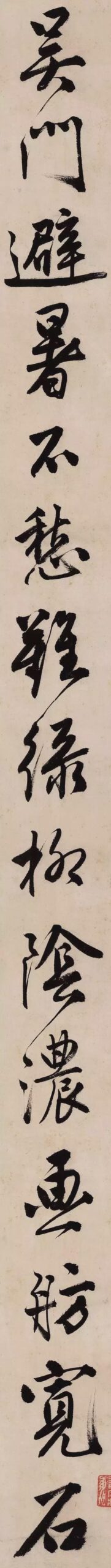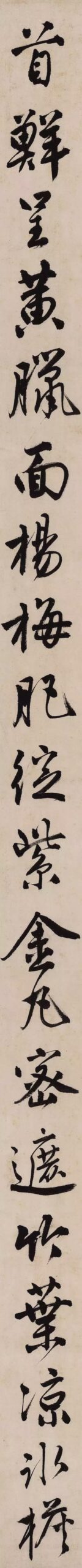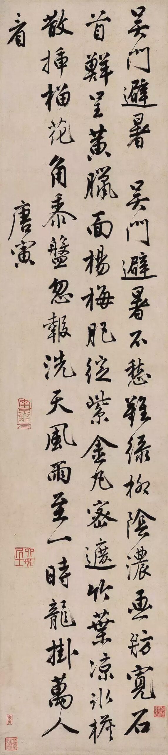 历代书法唐寅行书《吴门避暑诗》6唐寅《吴门避暑诗》 纸本 行书 31X138cm 辽宁省博物馆藏 唐寅《吴门避暑诗》 分行布白,恰到好处,运笔不急不滞,圆润秀丽,肥瘦得宜,为中国著名行书名帖之一,现藏辽宁省博物馆。唐寅书法为画名所掩,主学赵孟頫,受李北海影响,俊逸挺秀,妩媚多姿,行笔圆熟而洒脱,唯笔力稍弱,钩挑牵丝。 吴门避暑不愁难,绿柳荫浓画舫宽。 石首鲜呈黄蜡面,杨梅肥绽紫金丸。 密遮...2025-09-30标签:行书 / 魏晋南北朝