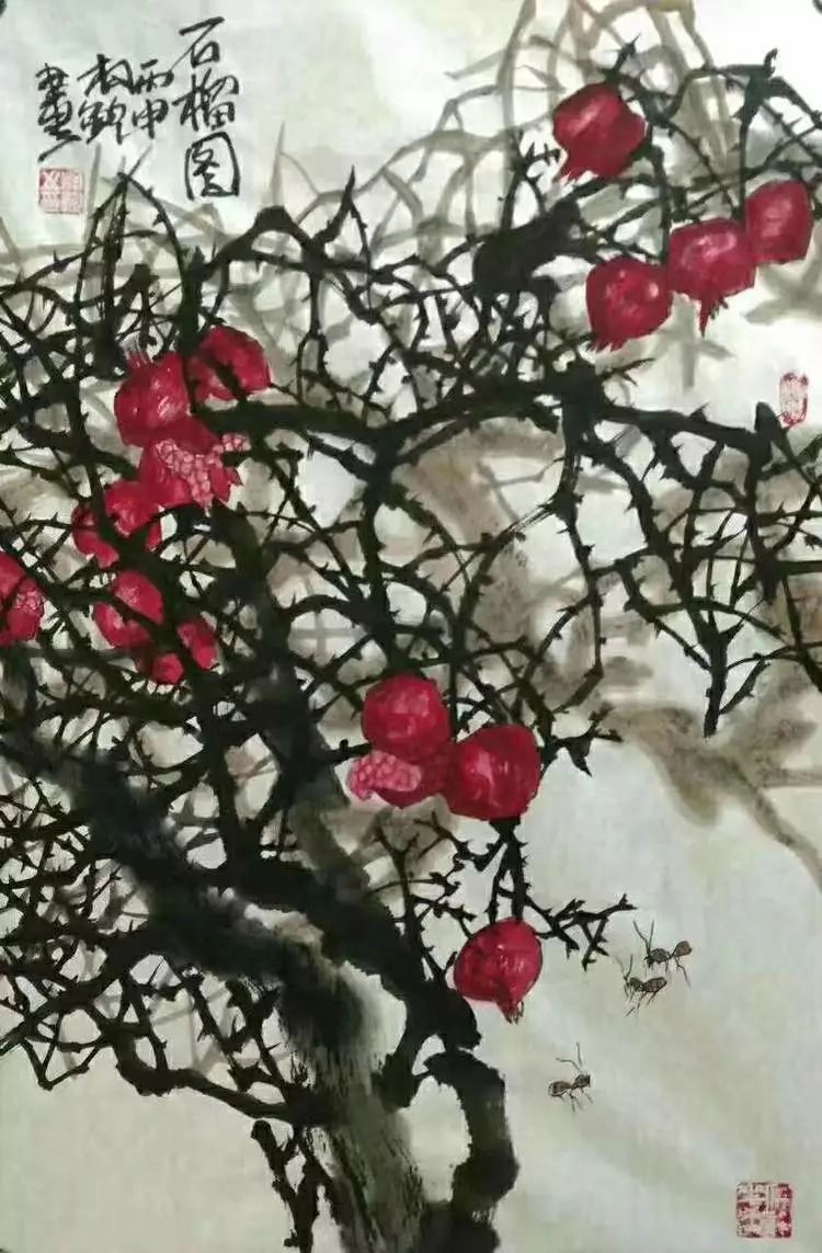 2柯鲍作品 石榴图(国画小品68x46cm)。 柯鲍, 原名王科宝,1964年生于山东省济南市,1990年就读于山东工艺美术学院染织设计系,1998年在广东美院研修,2001年毕业于北京画院研修生班,现任山东省中国画院副院长,系中国国画家协会理事、中国书画家联谊会理事、中国青年书画家协会常务理事、凤凰画院名誉院长、齐鲁国画院副院长、中国美术家协会山东分会会员,...