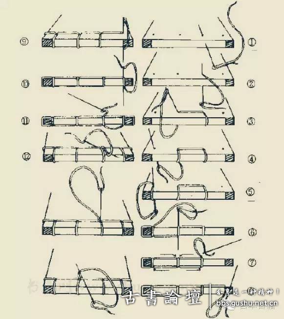 5用线装订书籍,不仅要照顾到兼顾耐用,还应考虑线的质地、颜色与书籍是否协调。线有丝线、棉线和粗细之分,选择用线还应根据书的具体情况来决定。量线订线以前,将椎完眼的书,正面向下,书背向着自己,根据书的长短厚薄,将线量好。一般情况下,用比书长六倍的线,即可订一册。锥眼多时,用线也相应要长些。例如六个眼的书,须用比书长六倍或更多一点的线。一部书,册数多时,可按第一册...