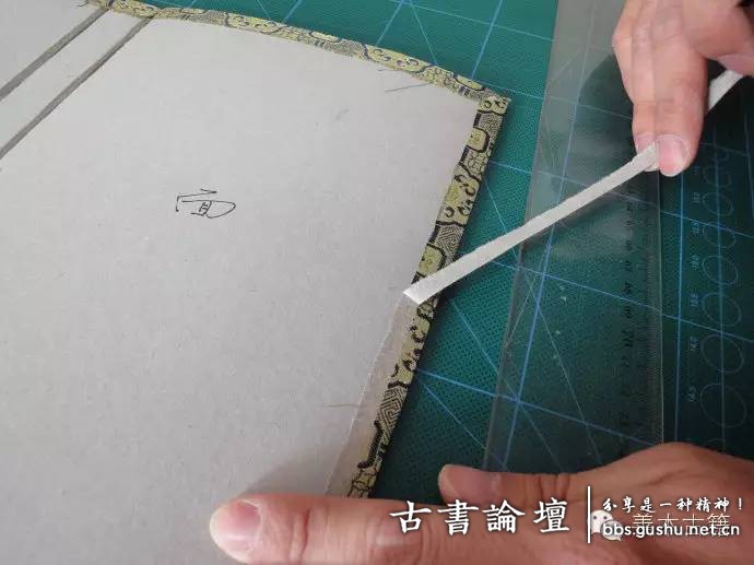 521、待包錦干后,剔直四邊毛茬,以求糊里紙干后整齊美觀。2、測量函套長度,計算別帶安裝位置。一般來說,別帶外口至天地頭邊的距離為函套總長度的五分之一。如書長30釐米,別帶外口至天地頭邊的距離即為6釐米。3、用一字啟或篆刻刀在墊條里側斜鑿別帶眼,斜鑿的好處可以使別帶拉力更緊。鑿眼的寬度依別帶的寬窄而定。 4、按照函套的厚度剪下相宜尺寸的別帶、扣帶。要注意,將別帶...