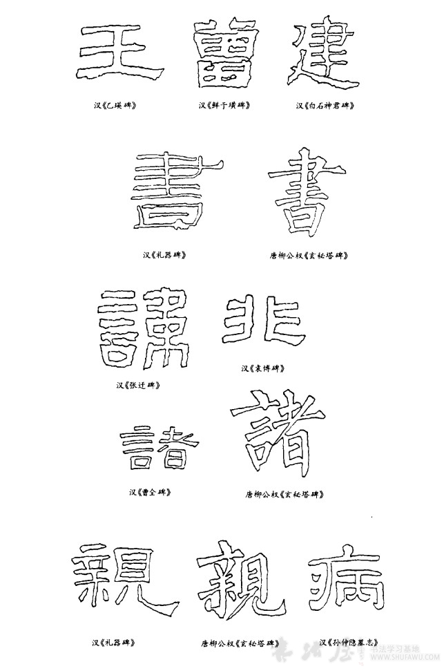 1东汉隶书的结体 横平竖直:横平竖直是隶书结体最基本的法则,案验汉碑无不如此。隶书的这一准则是从篆书来的。书体发展到北朝碑刻,出现了“斜画紧结”和“平画宽结”两大类型。“斜画紧结’是新书体,如北魏《龙门二十品》、《张猛龙碑》等,横画皆向右上敬斜,结构紧密,而“平画宽结”则是继承了隶书遗法,如北魏《吊比干文》,东魏、北齐的墓志。四山摩崖等,字都是横平竖直,结体宽...