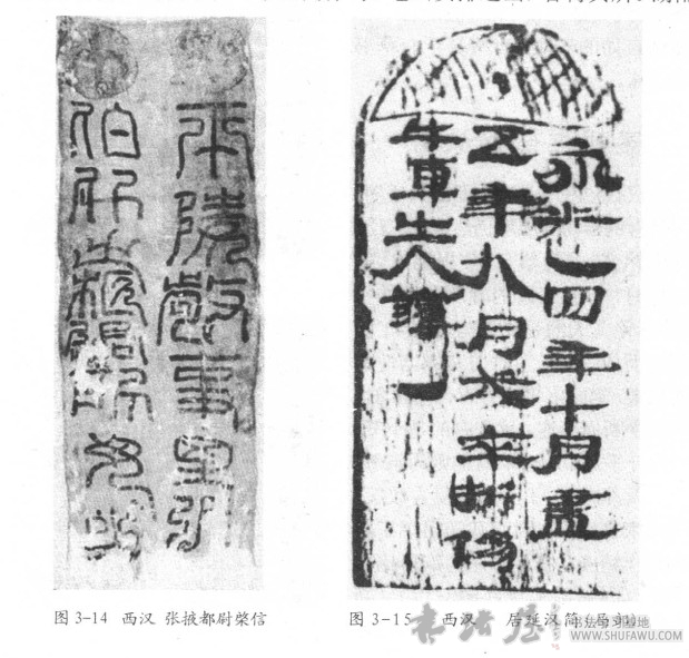 1漫无羁绊自由书—汉代篆书墨迹 汉代篆书墨迹保存至今的数量不多,有《武威张伯升枢铭》、《武威壶子梁框铭》、《张掖都尉弟信》(图3-14)等。《张掖都尉桨信》字形是秦始皇“书同文”后的l眨统秦小篆。六‘户1,除“张”‘名较平稳端庄外,其余笔画均屈折断续明显,乃是被揉搓后修复招皱与破损时所致。它的章法则宛如一方汉印,6字空间停匀,笔画安排适当,各得其所。湖南长沙马...