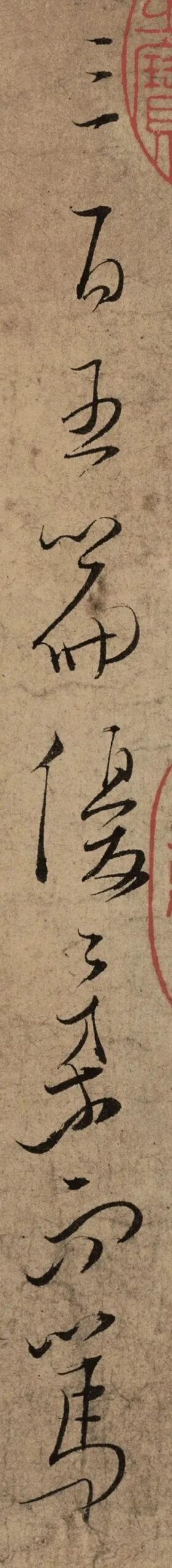 1五代,杨凝式书,纸本,手卷,纵27cm,横21.2cm。草书8行,共85字 此卷最早为宋高宗内府之物,后入贾似道手中,至明代曾经“江阴葛惟善收藏”(都穆《寓意编》),《清河书画舫》又称“郡人王氏所藏”,明代为项元汴所有,至清代乾隆时进入内府。 书法由唐到宋,杨凝式是一转折人物,苏轼评曰:“自颜、柳没,笔法衰绝。加以唐末丧乱,人物凋落,文采风流扫地尽矣。独杨公...