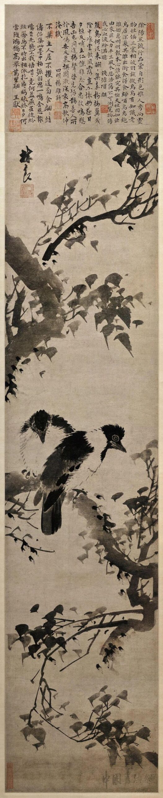 8林良《古树寒鸦图》 纸本 立轴 水墨 118.4×27.7cm 上海博物馆 图绘两只白颈寒鸦栖息在树枝上,树枝粗壮,树叶繁茂。技法上,以水墨粗笔勾画树枝和叶,又以细笔描画鸟儿羽毛,达到简练而准确,写意而形具。 林良,字以善,明代画家,画风用笔遒劲,如作草书;其水墨写意花鸟画与当时的艳丽工巧的宫廷画风不同,独树一帜的画法受人追捧。 —版权声明— 版权...