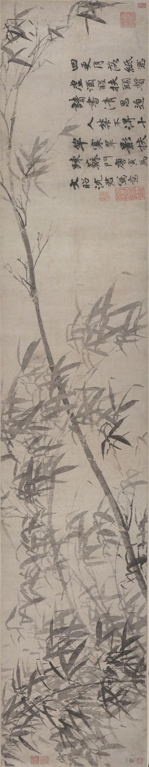 8唐寅《墨竹图》 纸本 长卷 水墨 29.1×150.2cm 大都会艺术博物馆藏 此图与大多数墨竹图不同,以倾斜式的竹子自左向右平铺开来,洒脱自然,再以新篁来补充左侧画面,浓淡相宜。整个画面工整秀丽,层次分明,竹势极为生动,展现了唐寅山水画潇洒飘逸的风格。 款识:四更月落纸窗虚,酒醒扶头暂读书。清思迫人禁不得,十竿寒翠影扶疏。苏门唐寅为文昭沈君写意。...