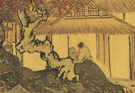 画面中人物活动多样,卷首处一间稍大的茅屋里,两名老者正席地而坐,促膝交谈;稍小的茅屋内,一名童子正在侍弄茶灶,为主人烹煮新茶。